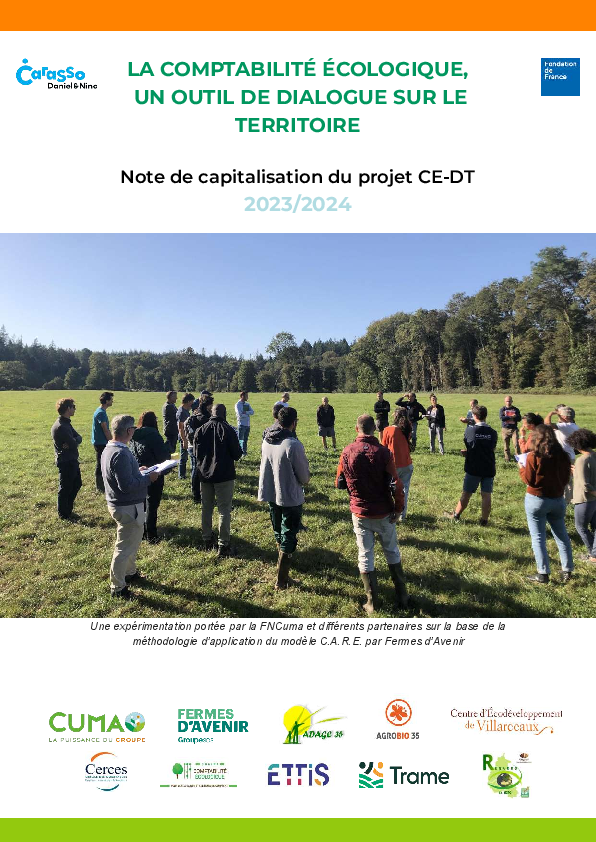Entre 2023 et 2025, la Fédération Nationale des CUMA (FNCUMA) a impulsé et piloté le projet « Comptabilité Écologique pour Dialoguer sur le Territoire », financé par la Fondation de France et la Fondation Daniel & Nina Carasso. Le projet repose sur la mise au point d'un couplage entre les méthodes IDEA4 et C.A.R.E. (Comprehensive Accounting in Respect of Ecology) expérimenté en Ille-et-Vilaine (35) sur 10 fermes d’élevages bovins laitiers bretonnes. Les résultats des comptabilité élargies sont présentés sous la forme de fiches pédagogiques.